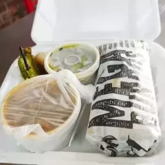 Ideal para 3 personas, dos burros grandes de 330gr cada uno, carne asada, queso navarro, salsa roja, verde y martajada