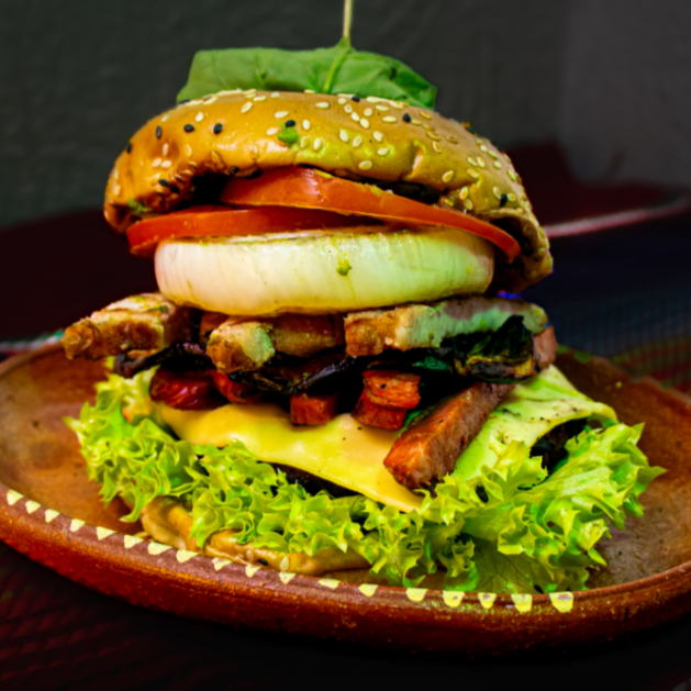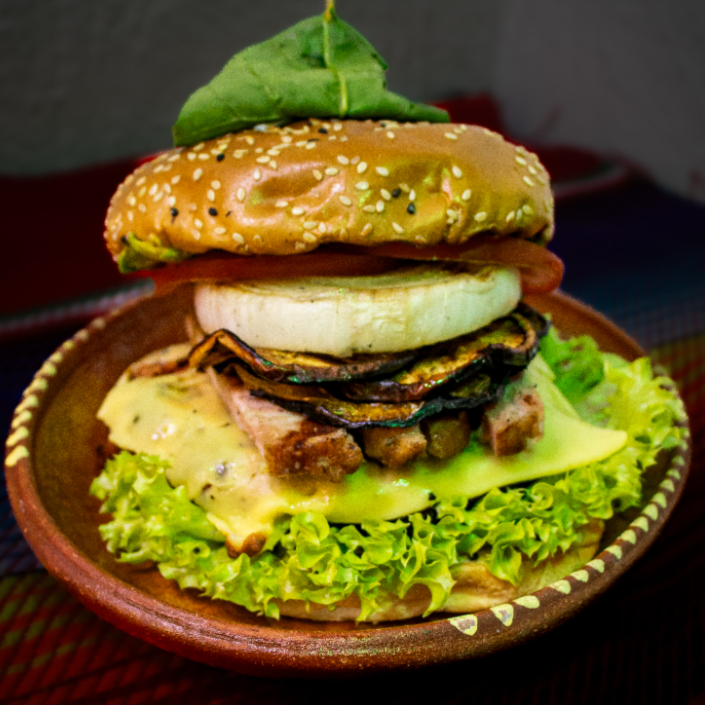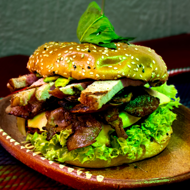200 gramos de carne para hamburguesa, chuleta asada, pimiento morrón asado, queso manchego, cebolla asada, aguacate, jitomate y hojas verdes.