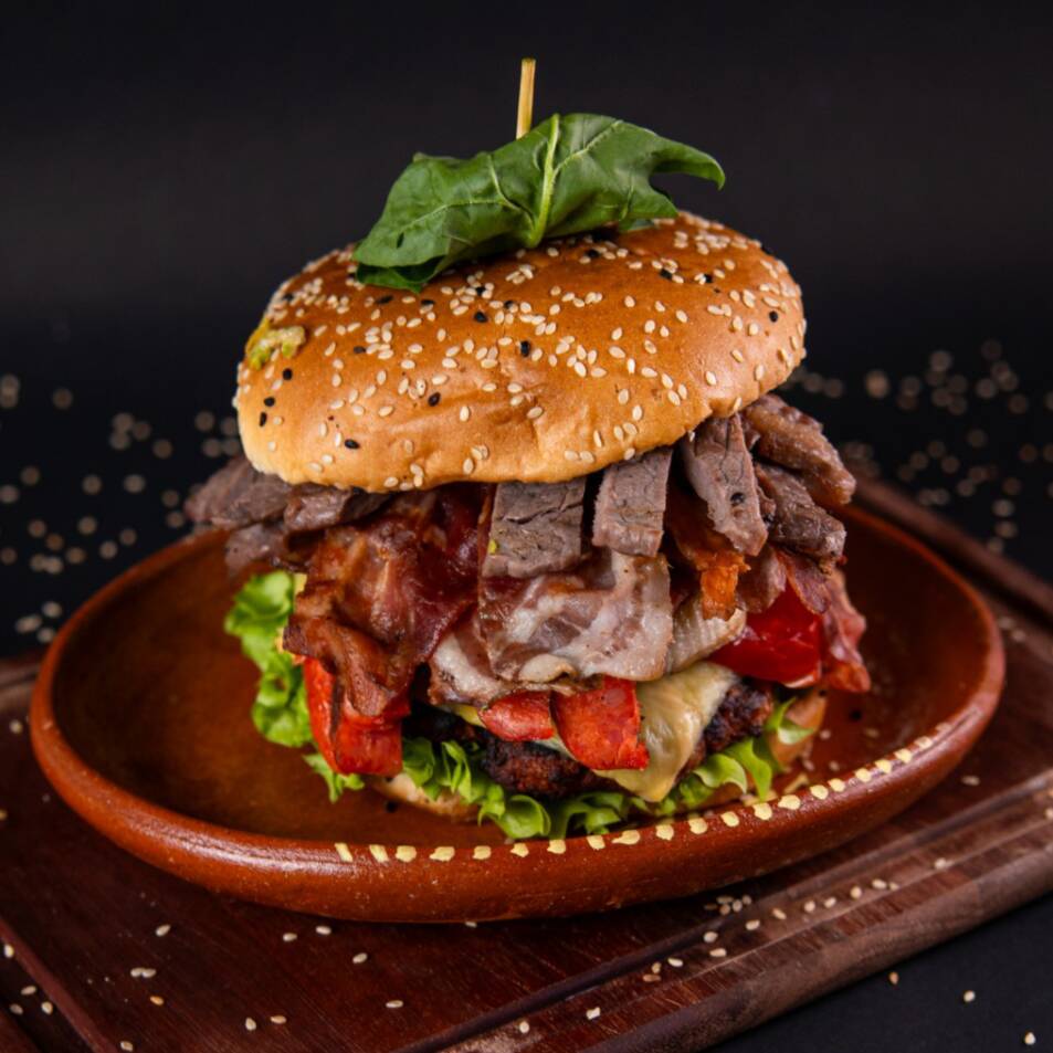 200gr de carne para hamburguesas, bistec de sirloin, tocino, chorizo corona, queso manchego, cebolla asada, aguacate, jitomate y hojas verdes.