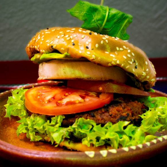 150 gramos de carne para hamburguesas, cebolla asada, aguacate, jitomate y hojas verdes.