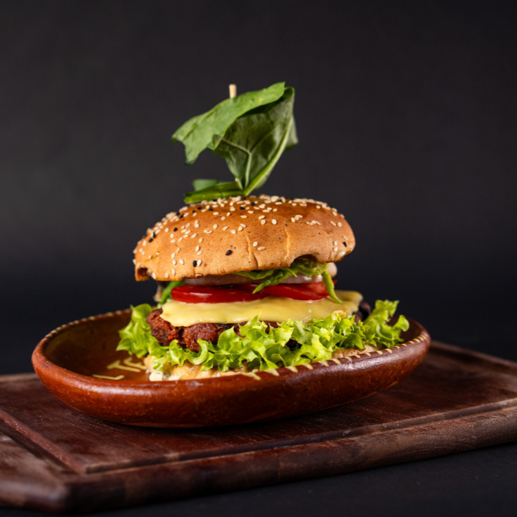 150 gramos de carne para hamburguesas, queso manchego, cebolla asada, aguacate, jitomate y hojas verdes.