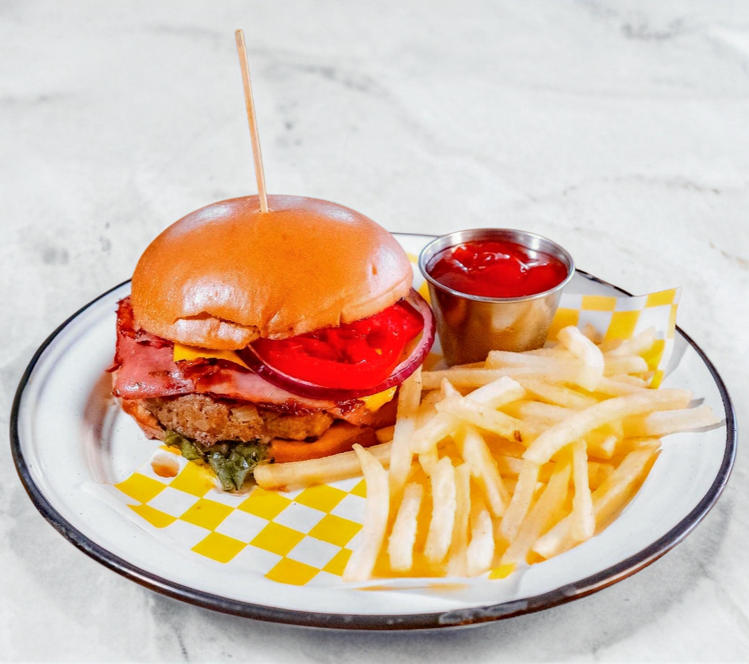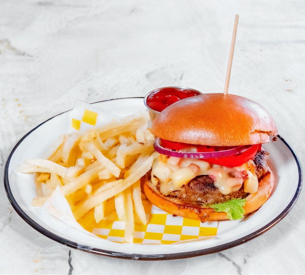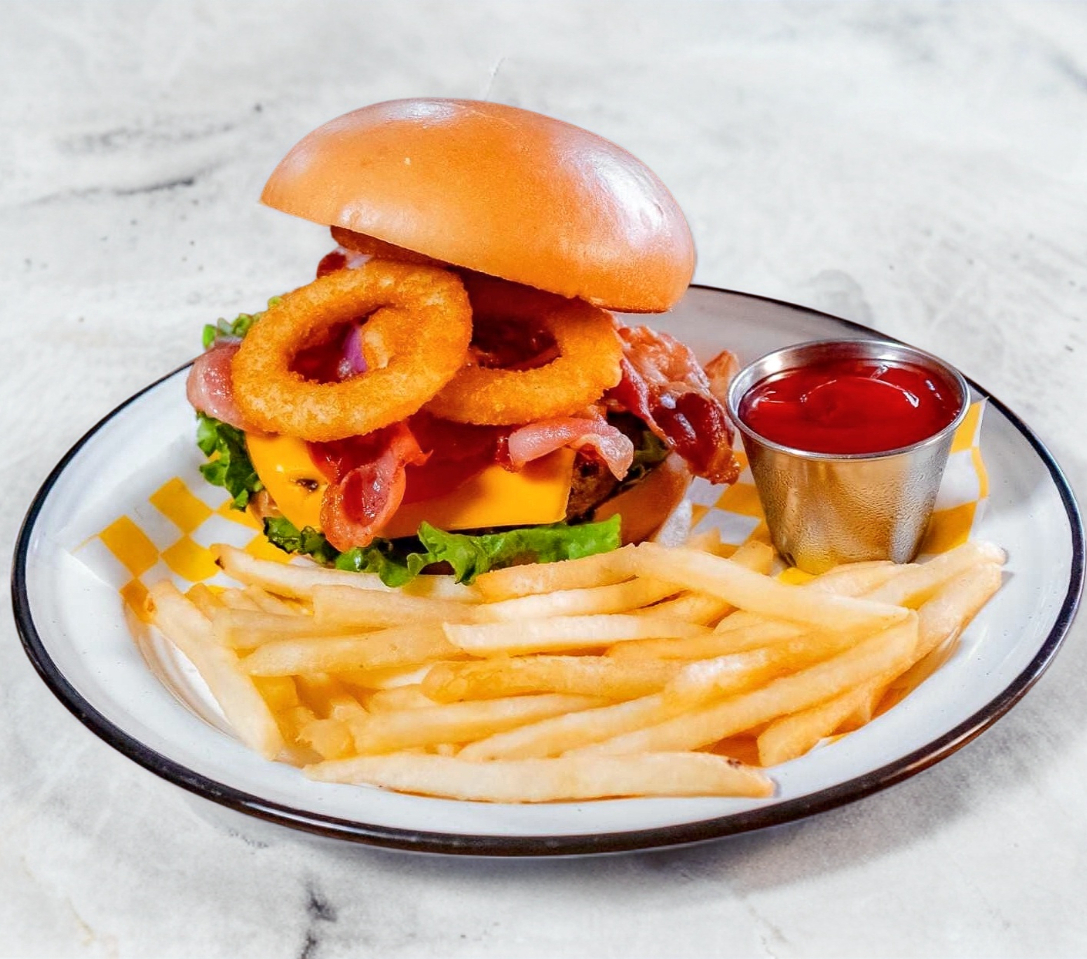 180 gramos de carne de res, queso amarillo, tocino, aros de cebolla y salsa bbq, acompañada de 160 g de papas fritas.