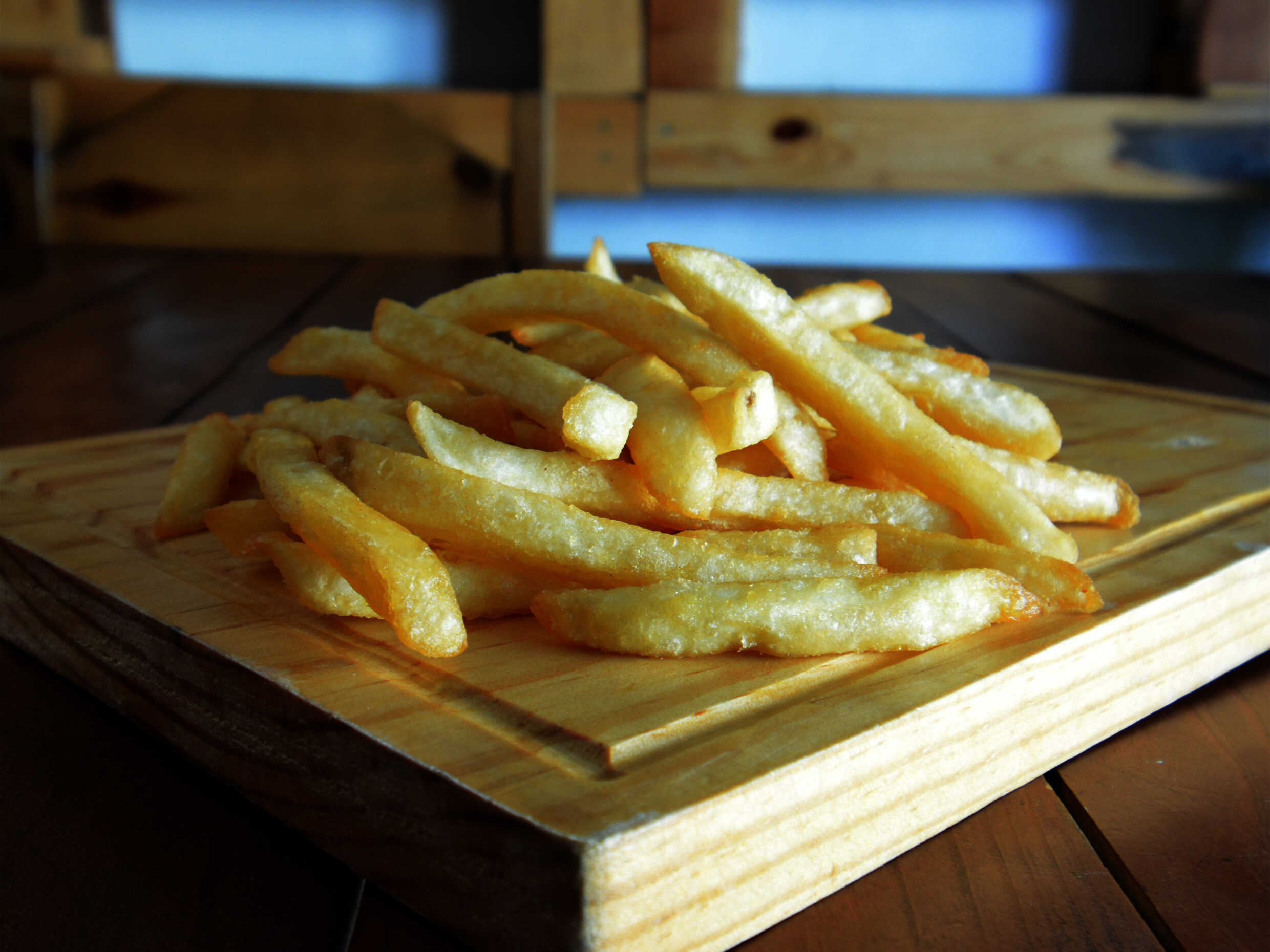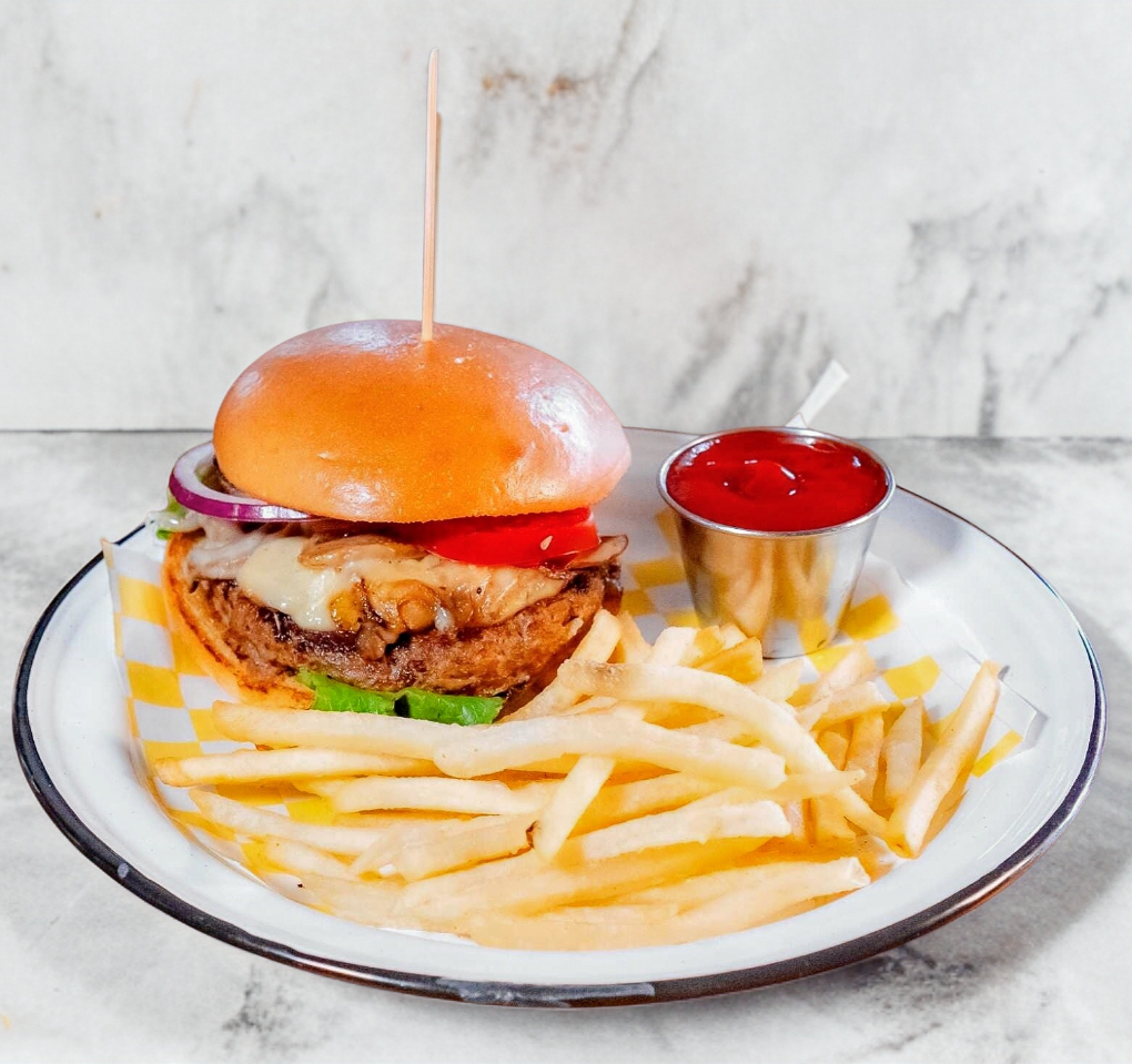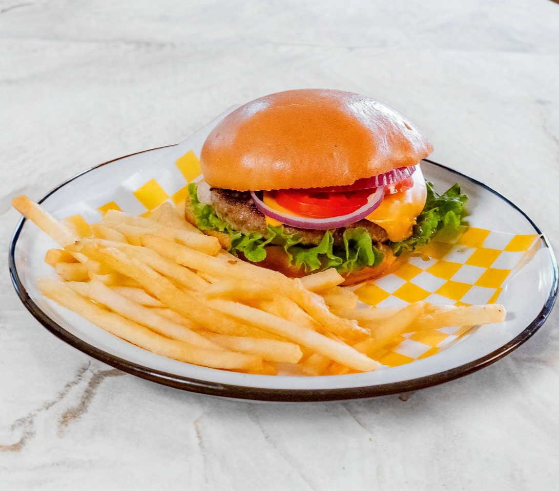 180 gramos de carne de res, queso amarillo, tocino, aros de cebolla y salsa bbq, acompañada de 160 g de papas fritas.