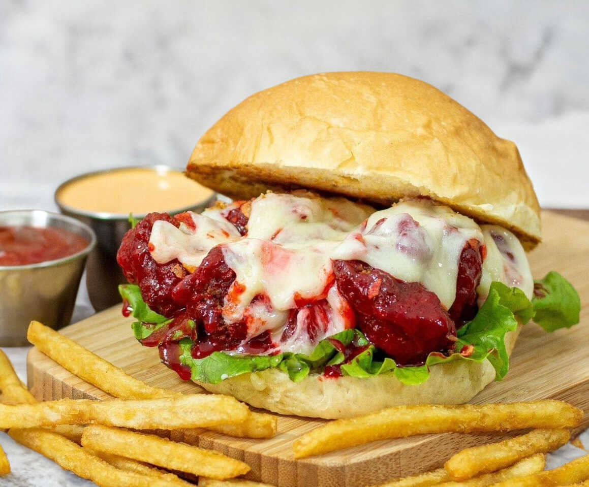 150 gramos de boneless con 1 salsa a elegir, con queso gratinado, vegetales en pan brioche con papas