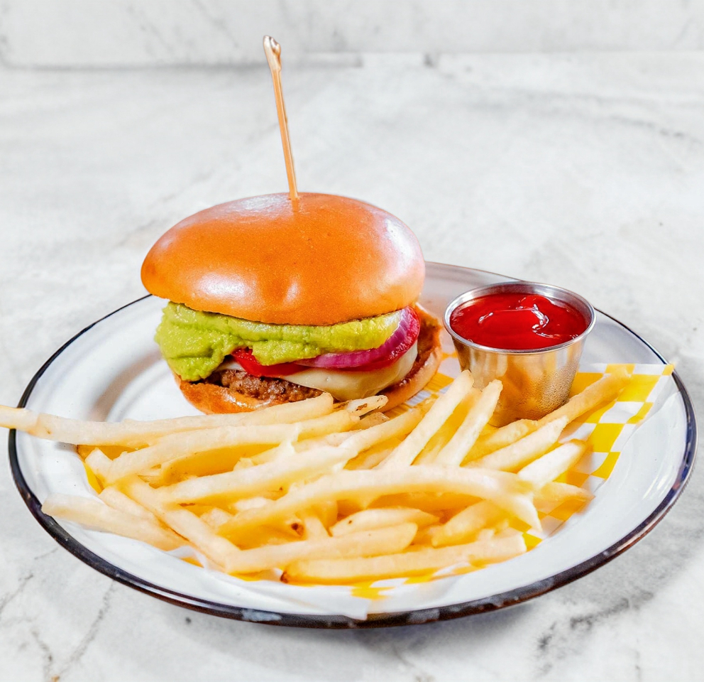 180 gramos de carne de res, queso blanco y delicioso guacamole, a compañado de 160 g de papas fritas.