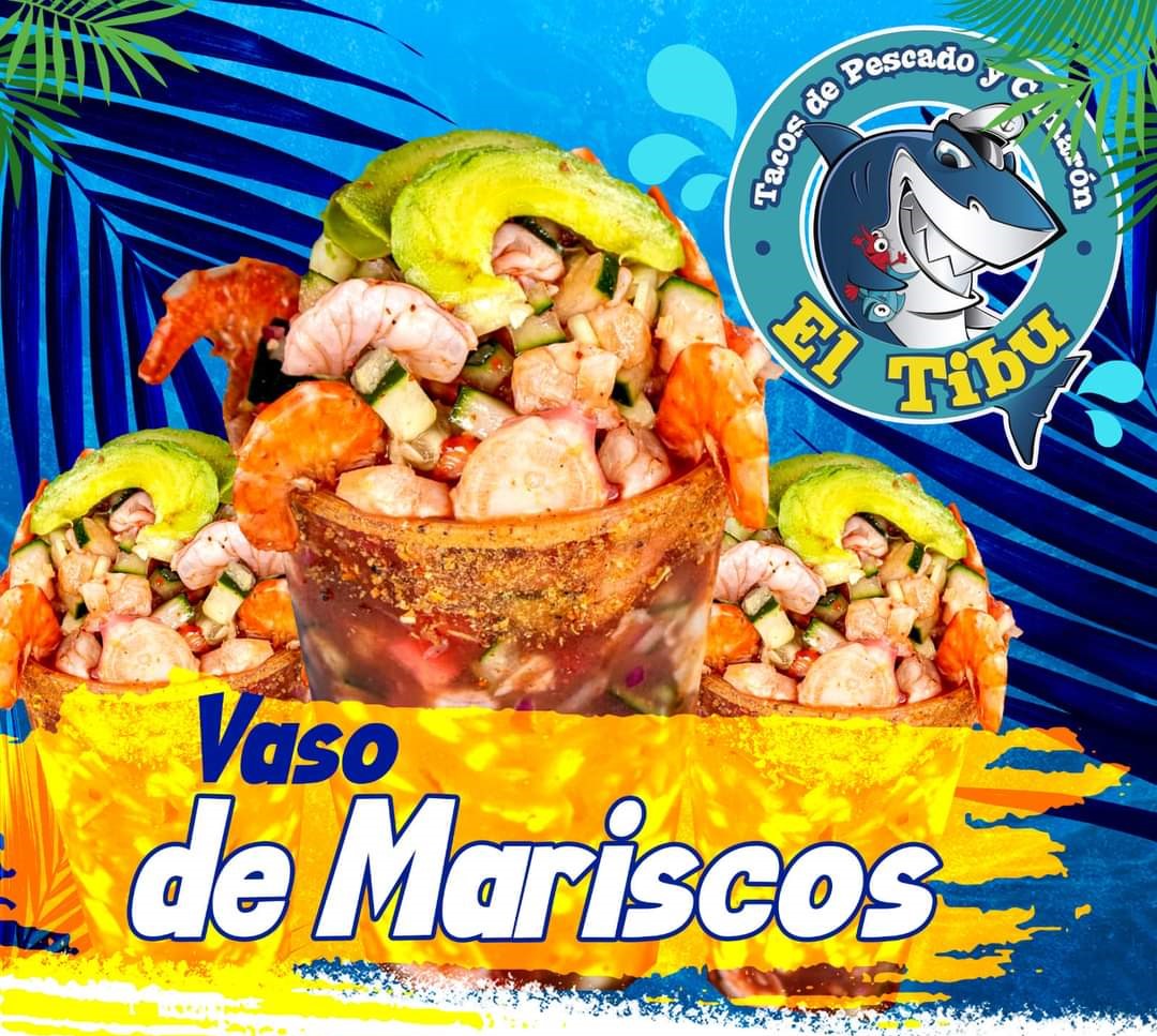 Callito de pescado, camarón cocido, crudo y seco y pulpo. Todos los vasos y tostadas llevan: pepino, jitomate y cebolla, especiales.