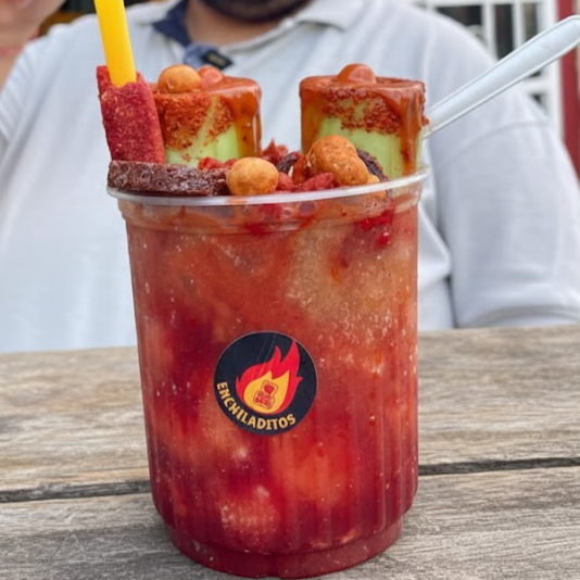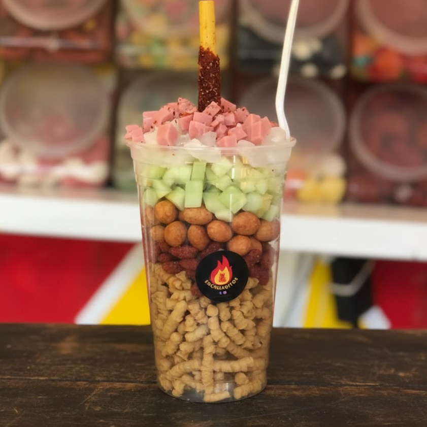 Chamoyada + pepinos ˋ+ cacahuate + rielitos + serpentinas