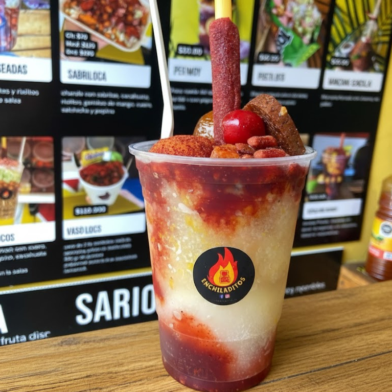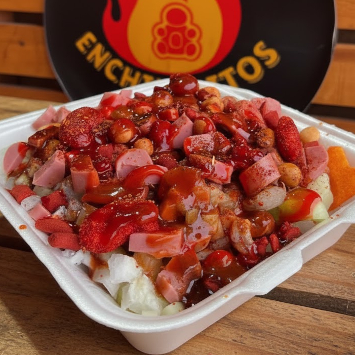 Chamoyada + fruta natural + gomitas +variedad de dulces + pulparindo + pelón pelo rico + banderilla + rielitos