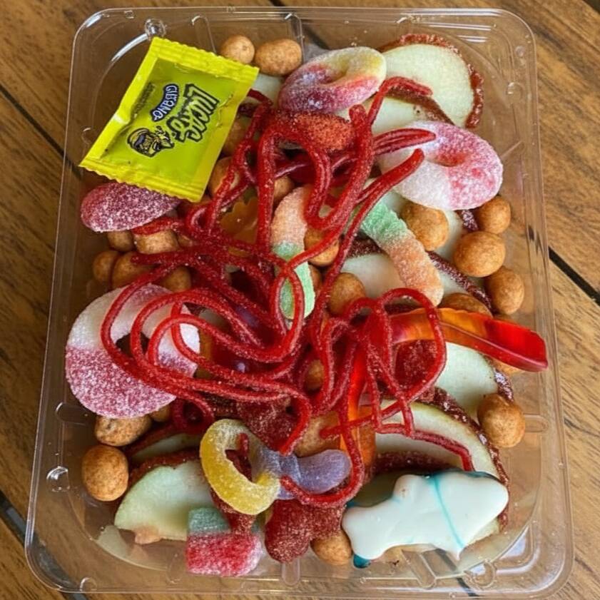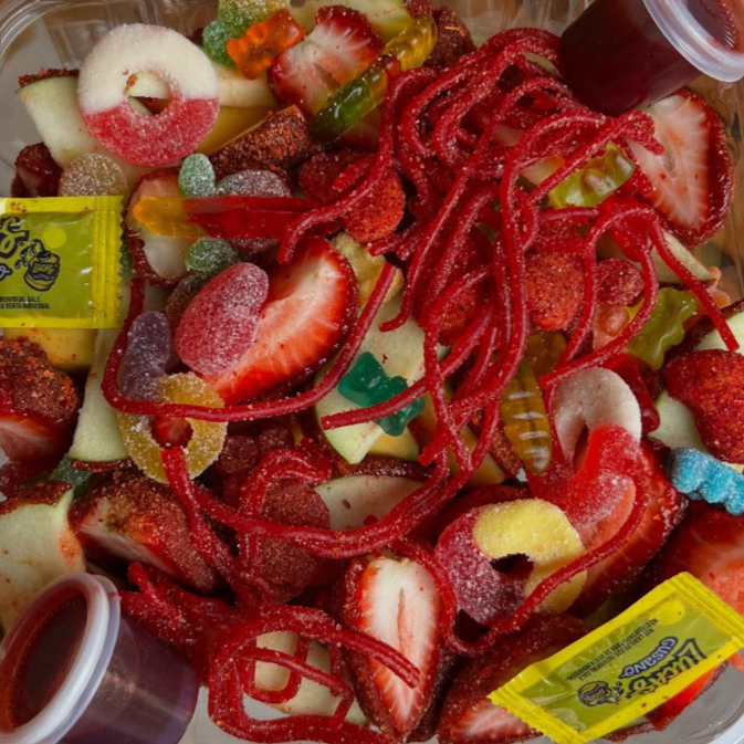 Charola de fruta forrada + gomitas enchiladas + skwinkles