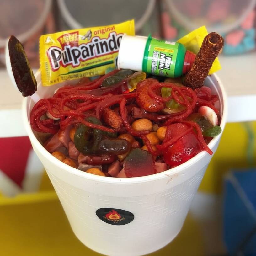 Papa + cuero + salchicha + pepino + cacahuate + rielitos + gomitas + skwinkles + pelón + pulparindo + dulces