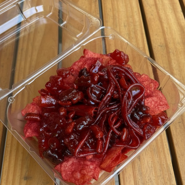 Fresa natural + chamoy casero + skwinkles + rielitos +banderilla de tamarindo