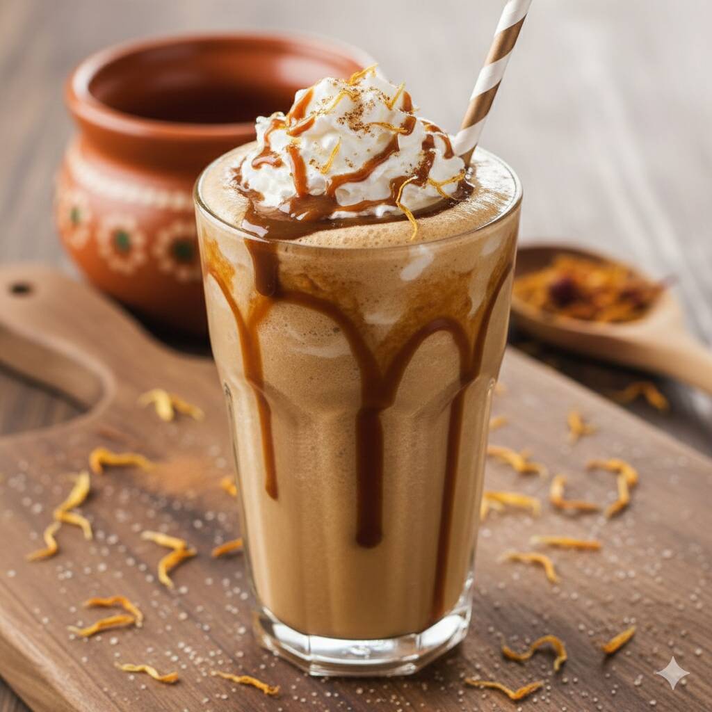 Cafe frappeado con base de Cajeta, chantilly, rayas de hershys y granillo chocolate.