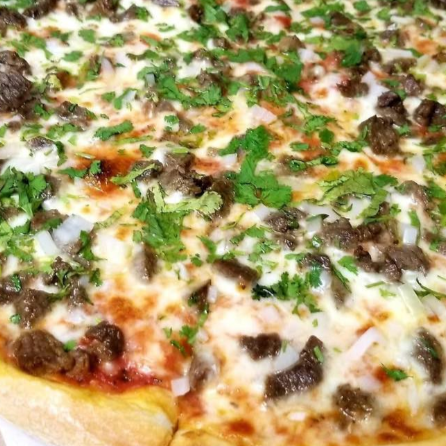 Carne molida, cebolla, cilantro y la cremosidad de nuestro aderezo de aguacate de la casa; la esencia del taco en una pizza
