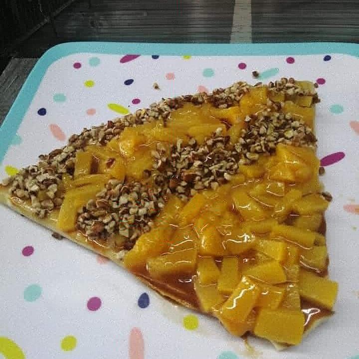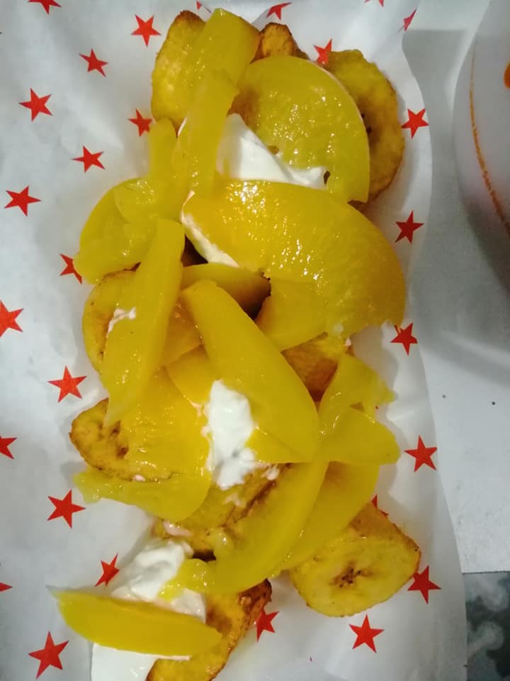 platano macho frito en aceite con mermelada lechera crema y chispas de colores con durazno en almibar