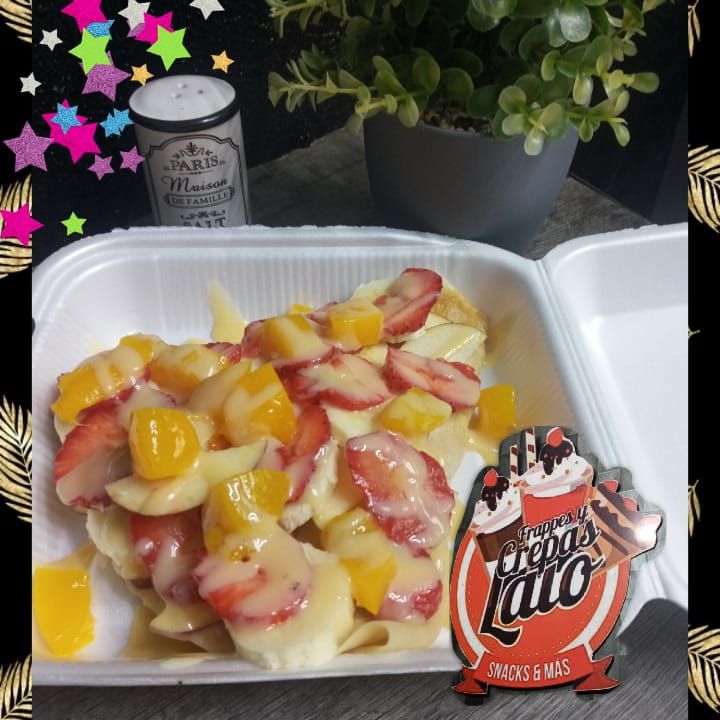 platano frito con frutas con mermelada de fresa lechera crema y granillo de colores