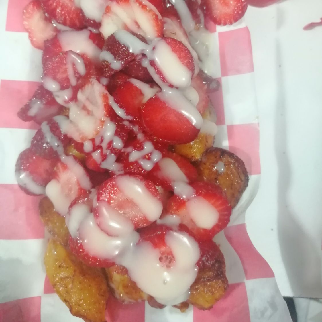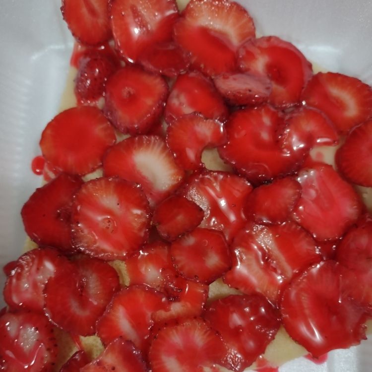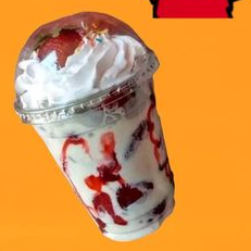 fresas naturales, con jarabe de fresa, crema dulce con un topping de chantilly y granillo de colores