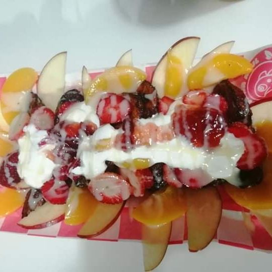 platano frito en aceite, con mermelada de fresa,lechera,crema y chispas de colores