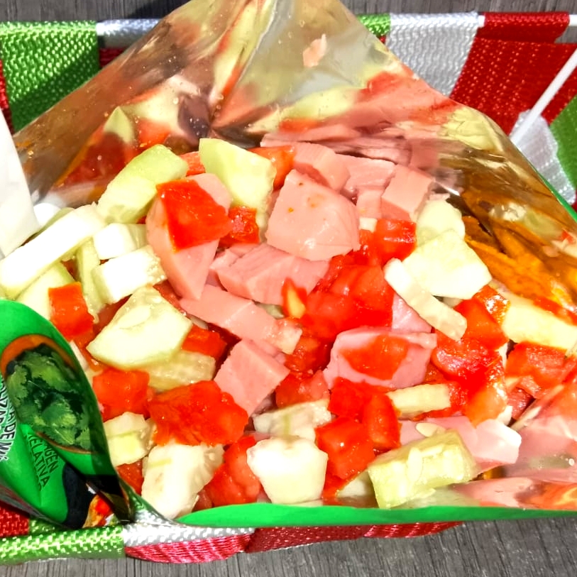 Tostitos, con salchicha, acompañado de pepino, jitomate, cebolla y salsas a elegir