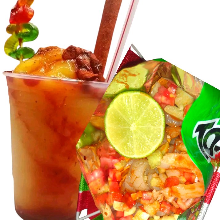 sabor limon con chamoy con un topping de panditas rielitos y una banderilla de tamarindo