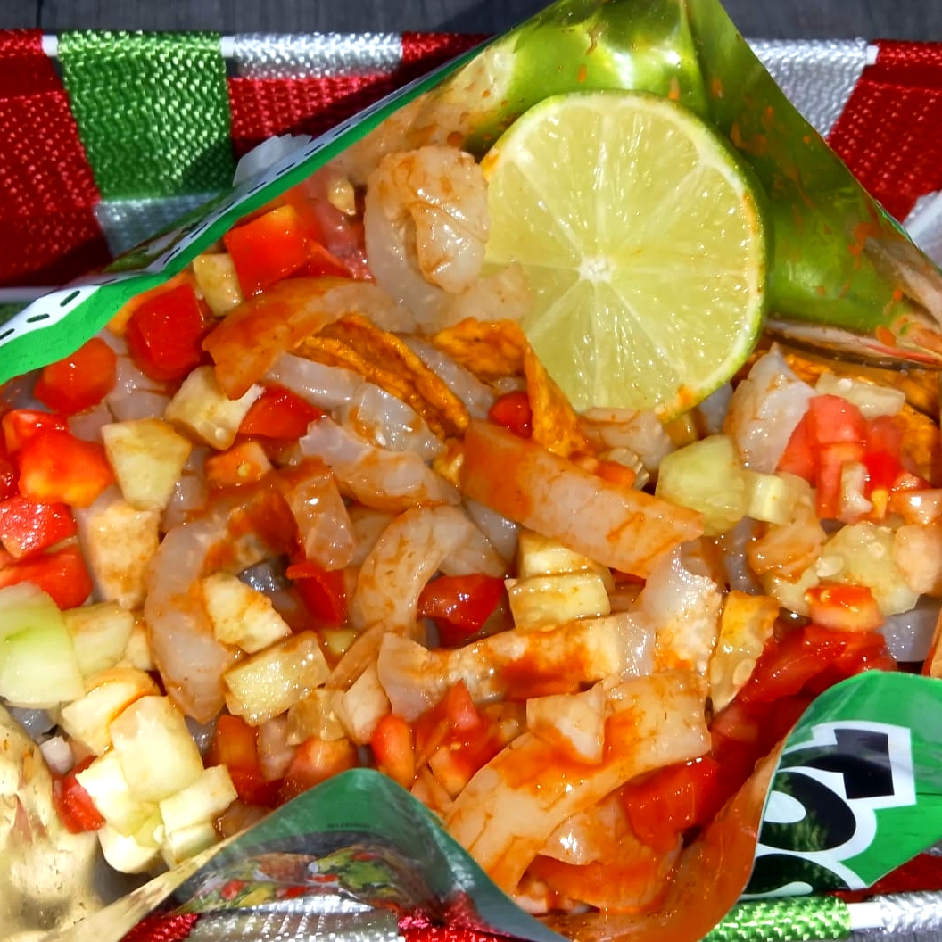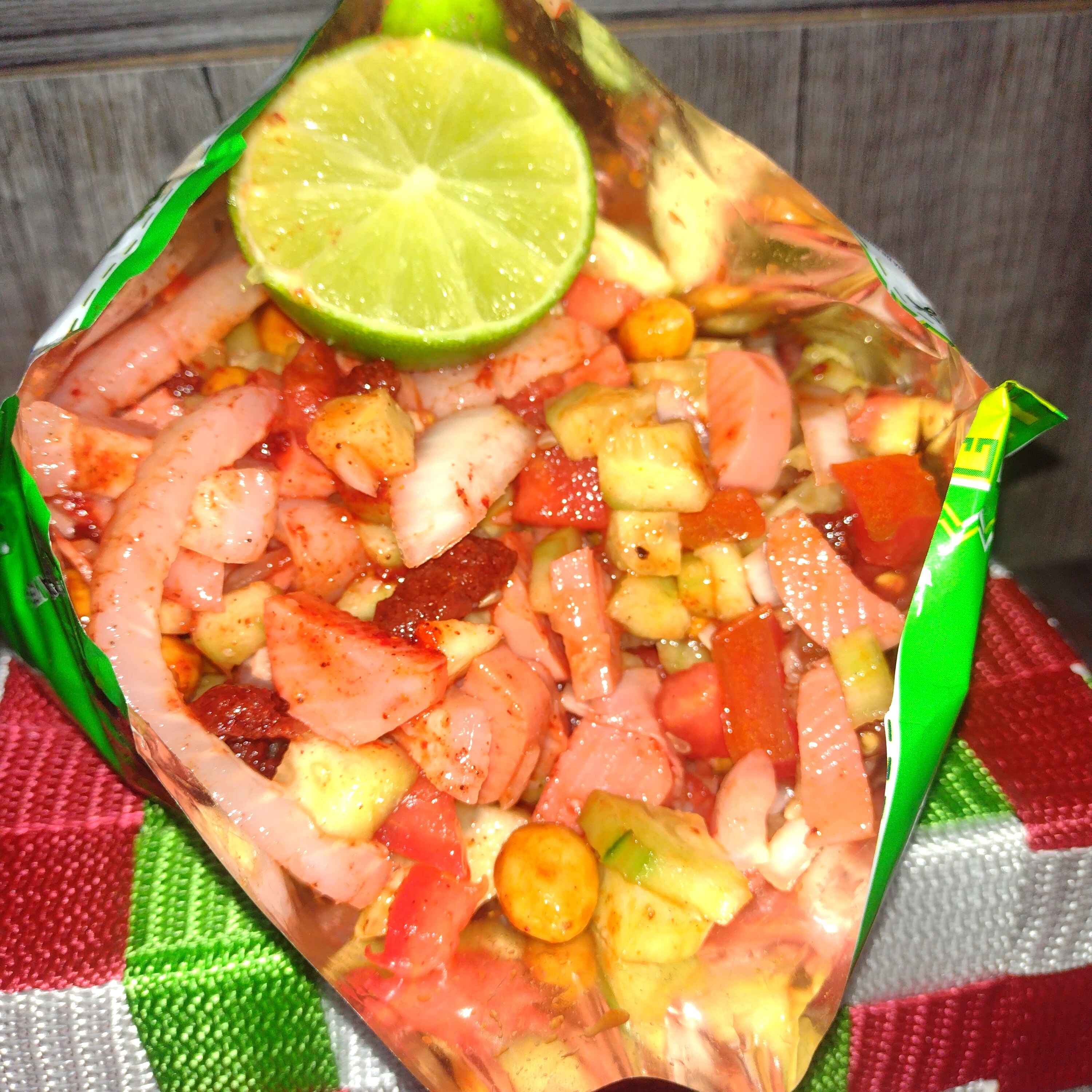 Tostitos con cuerito y salchicha acompañado de pepino,jitomate,cebolla, cacahuate japones y rielitos. salsas a elegir