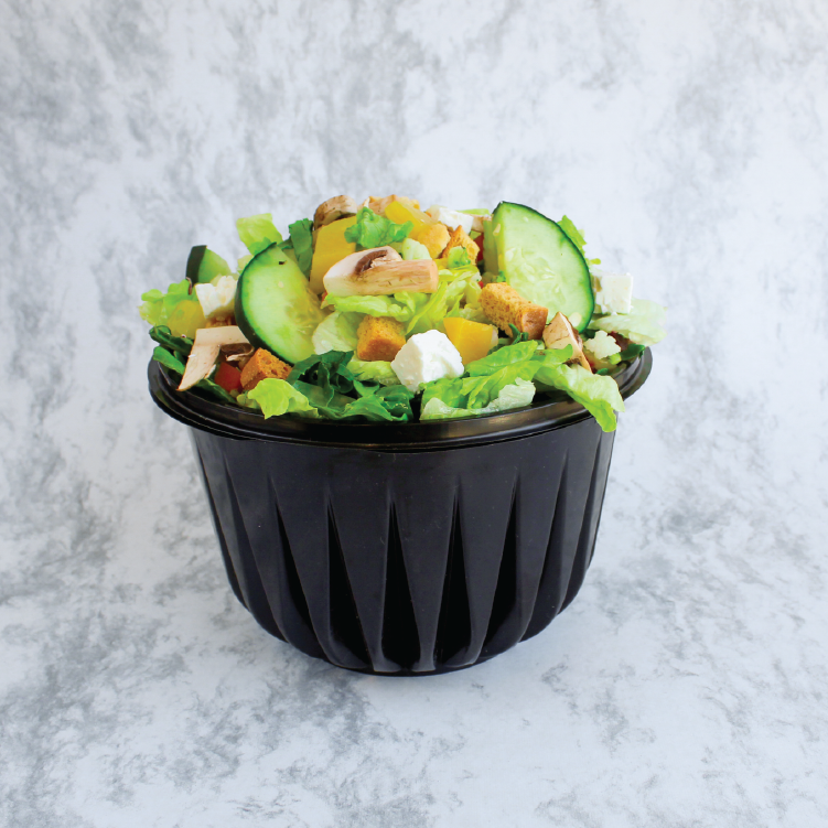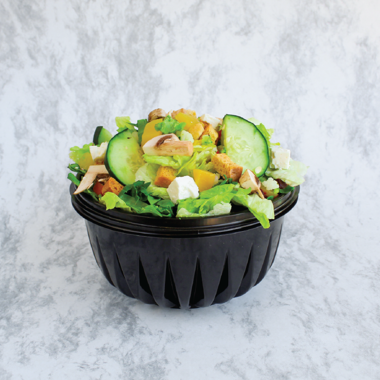 Cama de lechuga, dos ingredientes de barra fría, 80 grs de proteína a elegir, aderezo al gusto con un toque de crotón, galleta salada, cacahuate o tiras de maíz. *Aderezo aparte.