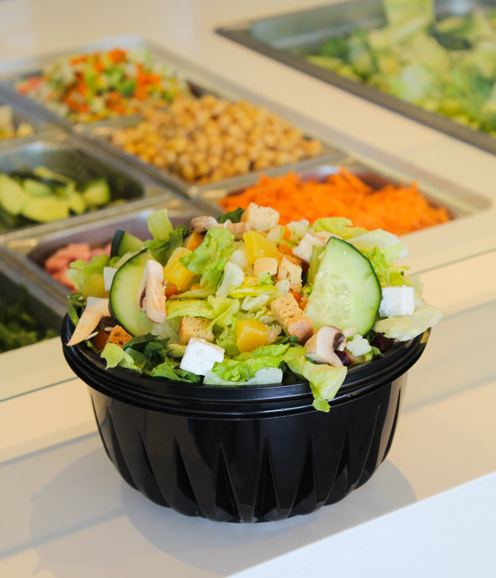 Cama de lechuga, dos ingredientes de barra fría, 100 grs de proteína a elegir, aderezo al gusto con un toque de crotón, galleta salada, cacahuate o tiras de maíz. *Aderezo aparte.