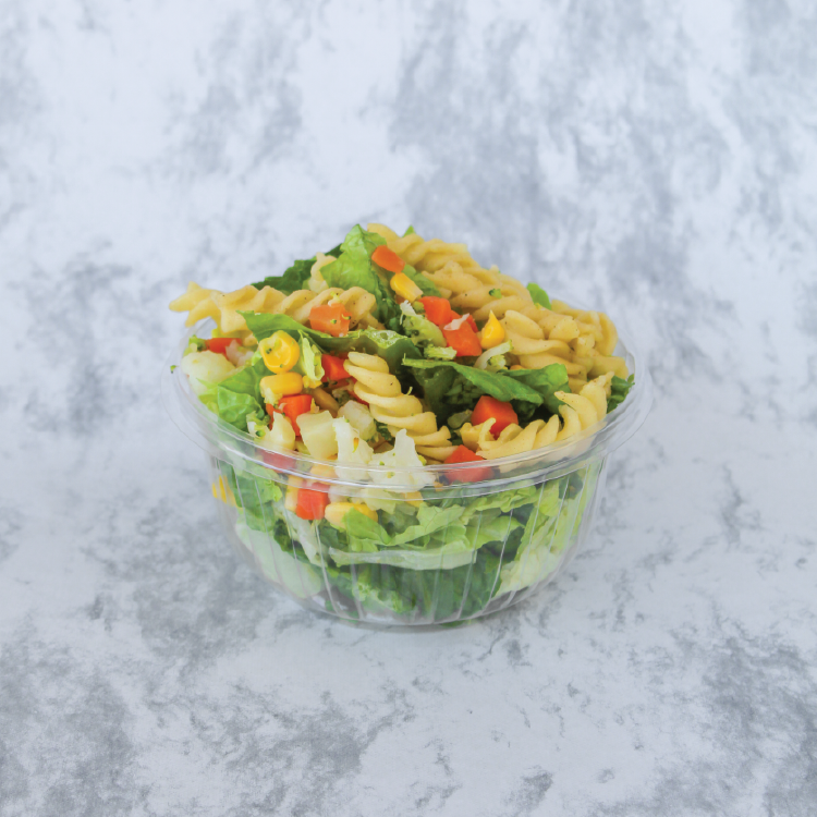 Cama de lechuga, espinaca, manzana con piña, pasta, mezcla del bajío, 100 grs. de pollo plancha, aderezo mango habanero o italiano y con topping mix.