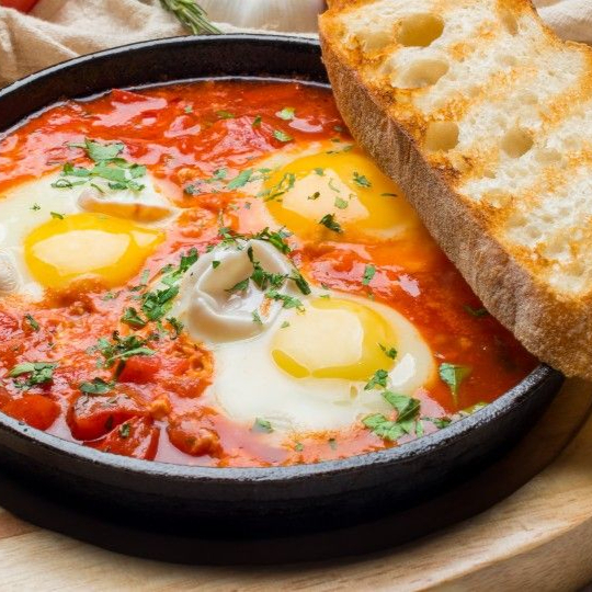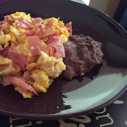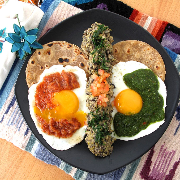 2 Huevos con jitomate cebolla y chile y acompañamientos