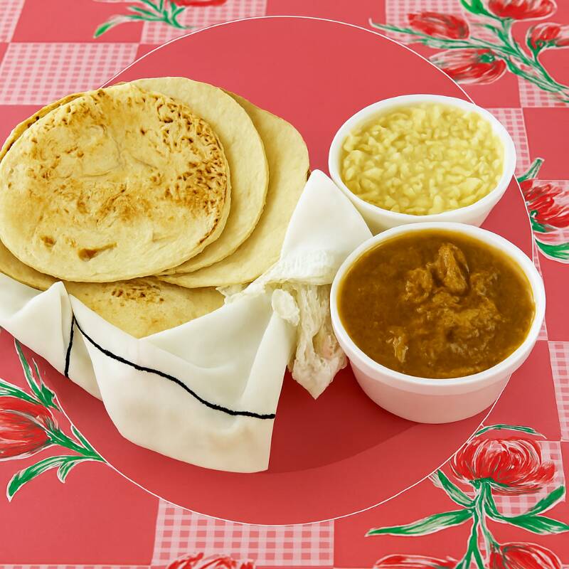 pollo desmenuzado y guisado acompañado de arroz y 3 tortillas hechas a mano (para 1 o 2 personas)