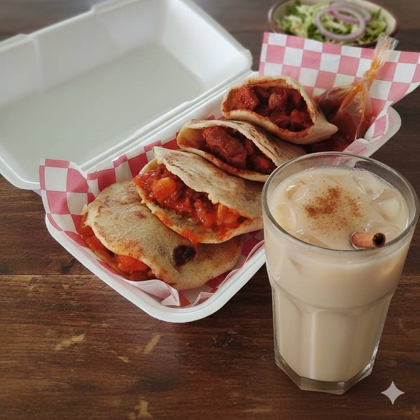 Combo de 4 gorditas con guisos a elegir, bebida pet 355 ml o agua fresca 500 ml