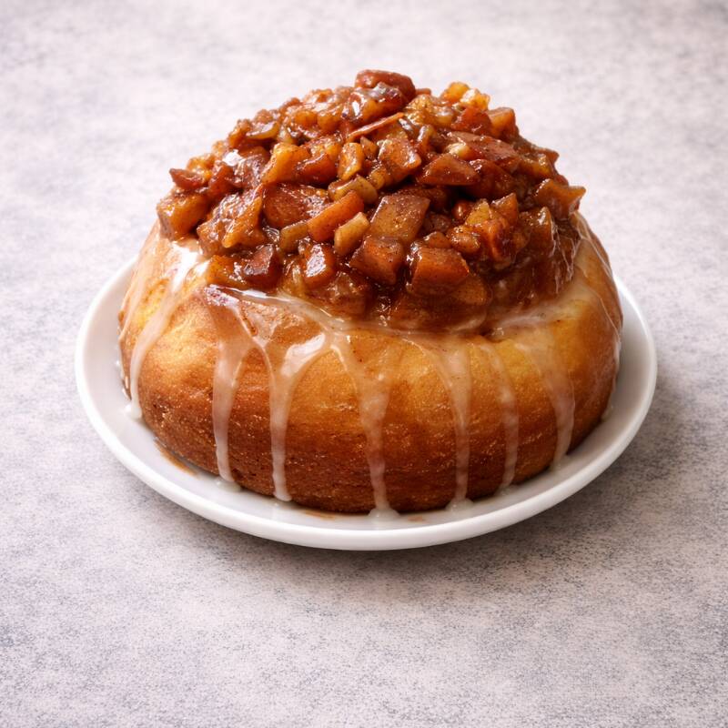 Rol de canela suave y esponjo, coronado con compota de manzana y canela