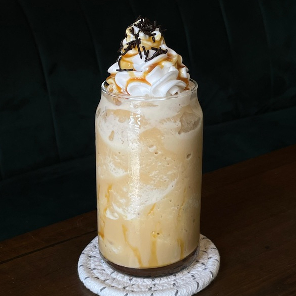 Bebida frappé cremosa y refrescante, preparada con hielo, leche, salsa de caramelo y un shot de café gourmet de la casa que le da un sabor intenso y aromático | 473 ml