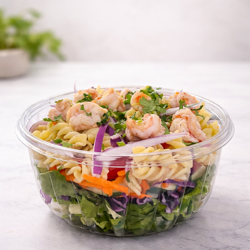 Lechuga, col, zanahoria, pepino, jitomate, cebolla, cilantro, pasta (130 g), camarones salteados (10 piezas)