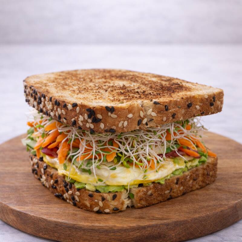 Pan multigrano, aguacate, huevo 1 pza, tocino, germinado, zanahoria, pepino, más tu aderezo favorito