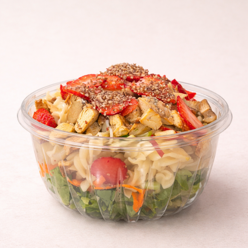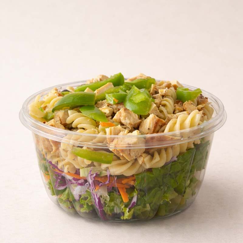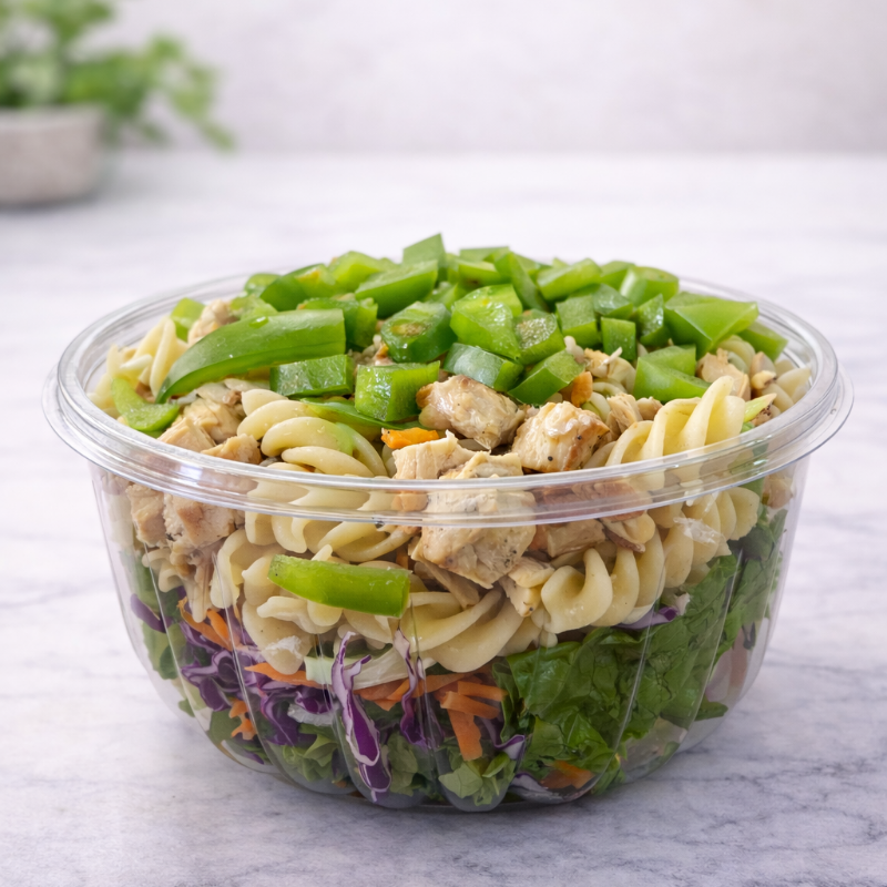 Lechuga, col morado, zanahoria, pepino, pimiento, pasta (170 g), proteína (120g)