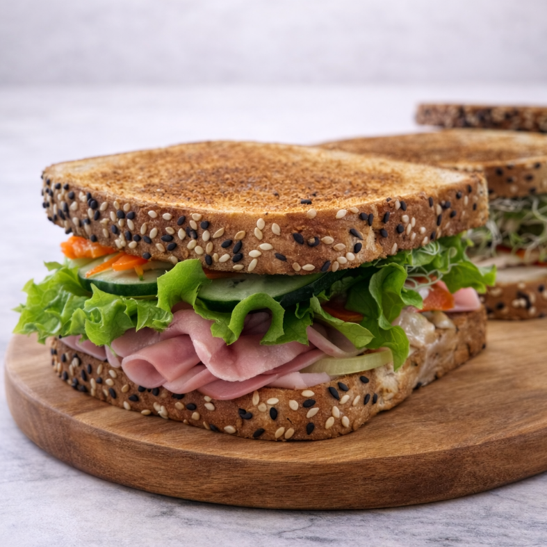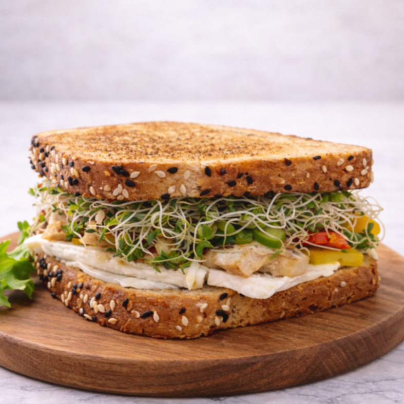 Pan multigrano, pollo al sartén 60 g, panela fresca 70 g, salteado de verduras, germinado, más tu aderezo favorito