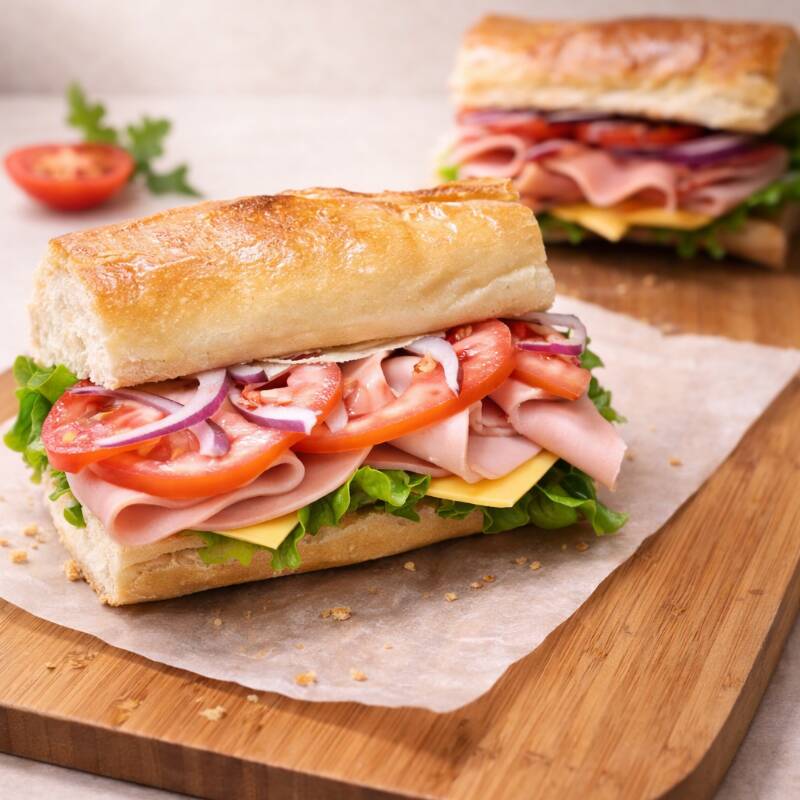 Baguette artesanal recién horneado, con jamón de pavo, salami, quesos manchego y gouda, vegetales frescos y nuestros aderezos irresistibles