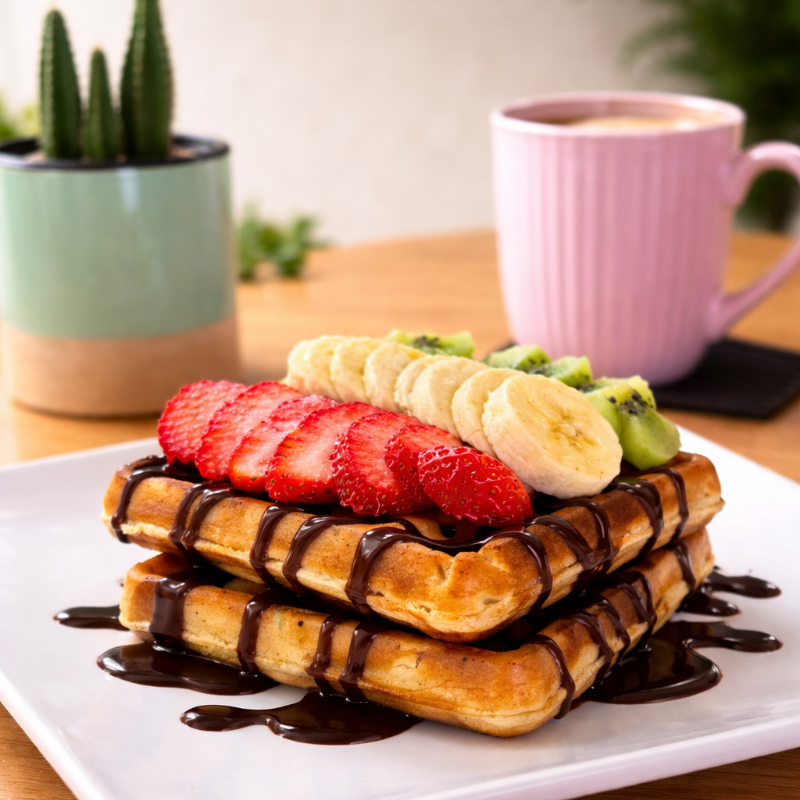 Waffle recién hecho, crujiente en las orillas y suave al centro, coronados con fresa, plátano, kiwi y 1 topping a elegir | 2 piezas