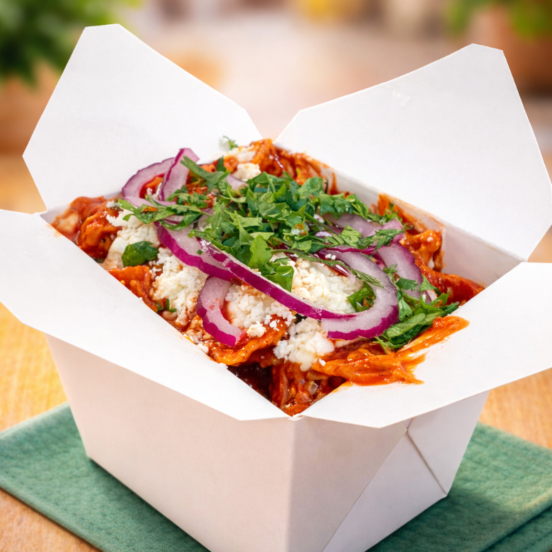 Chilaquiles en salsa roja ranchera, acompañados de frijoles, queso, crema, cebolla y cilantro.