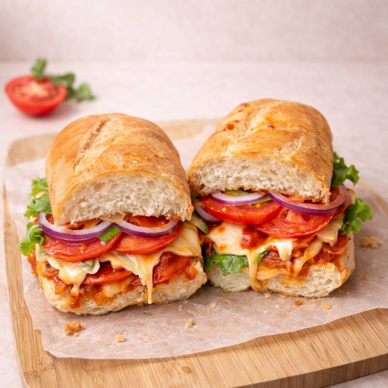 Baguette artesanal recién horneado, con pepperoni, manchego y gouda derretidos, salsa de pizza, vegetales frescos y nuestros aderezos irresistibles.