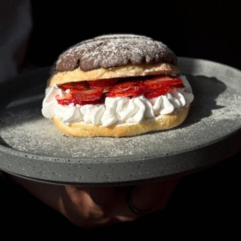Concha tradicional rellena de fresa, Nutella y crema para batir, suave y dulce en cada mordida.