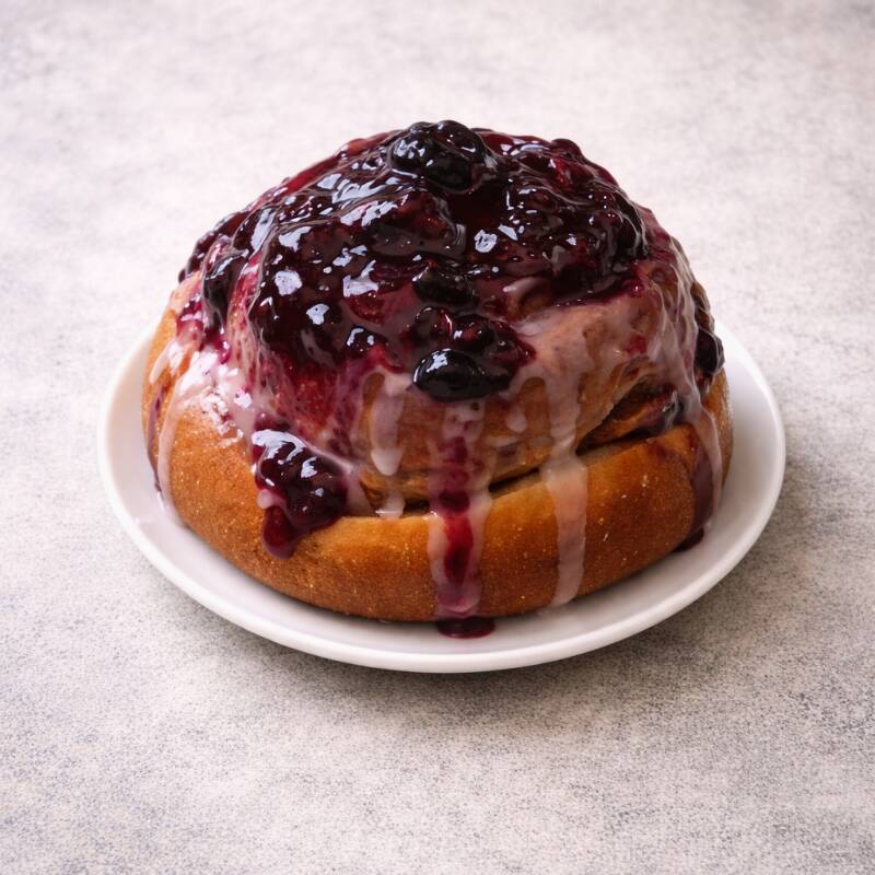 Rol de canela suave y esponjo, coronado con salsa de frutos rojos