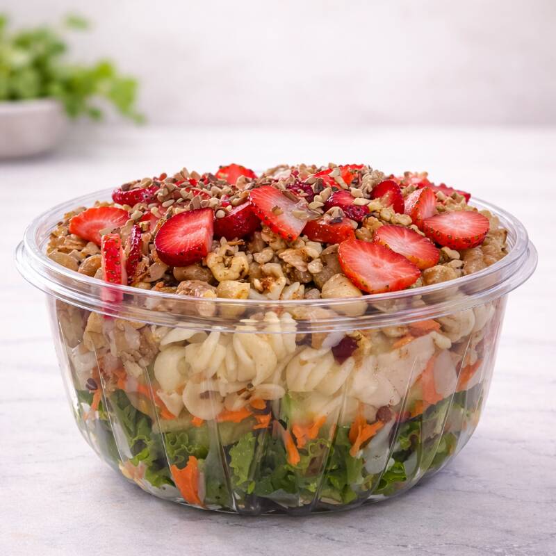 Lechuga, espinaca, zanahoria, pepino, manzana, fresa, nuez, pasta (170 g), proteína (120g)