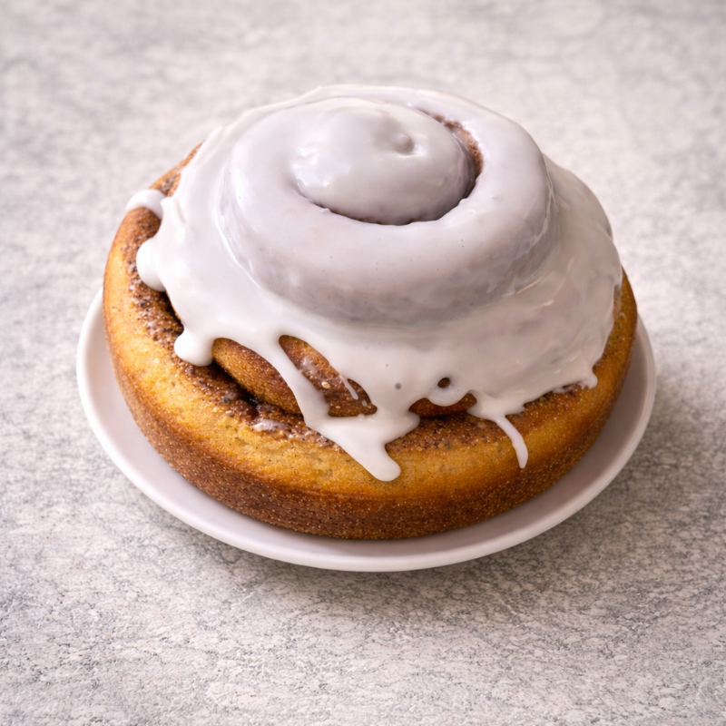 Rol de canela suave y esponjo, glaseado, lleno de aroma a canela.
