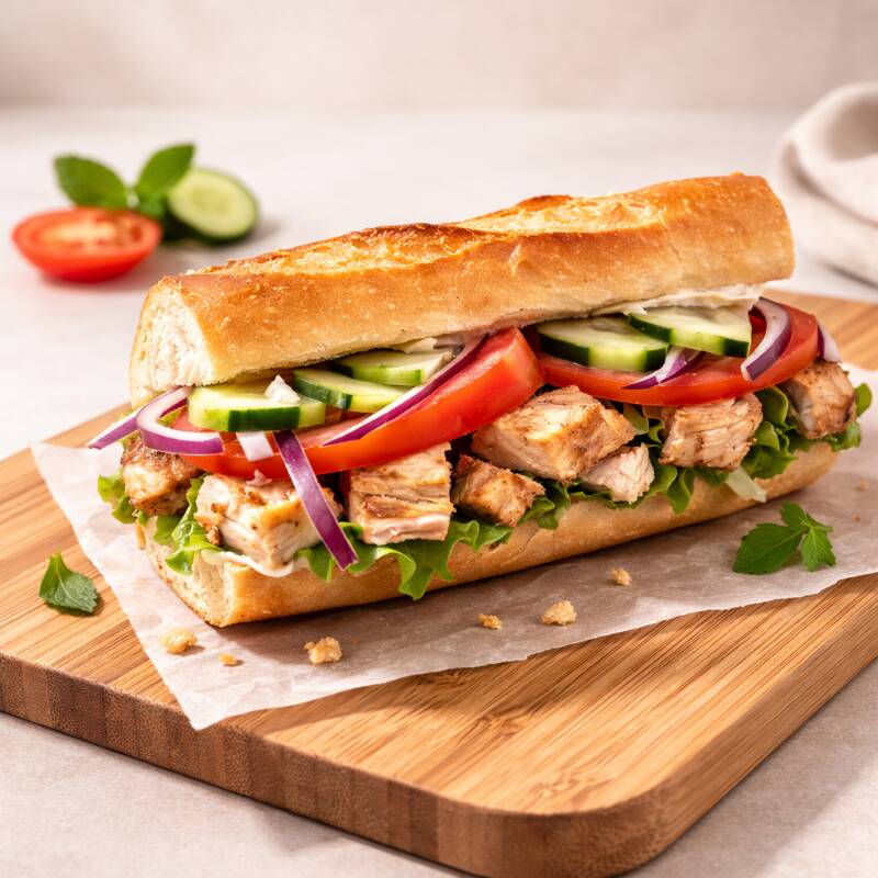 Baguette artesanal recién horneado, con pechuga de pollo al sartén (60g), vegetales frescos y nuestros aderezos irresistibles.