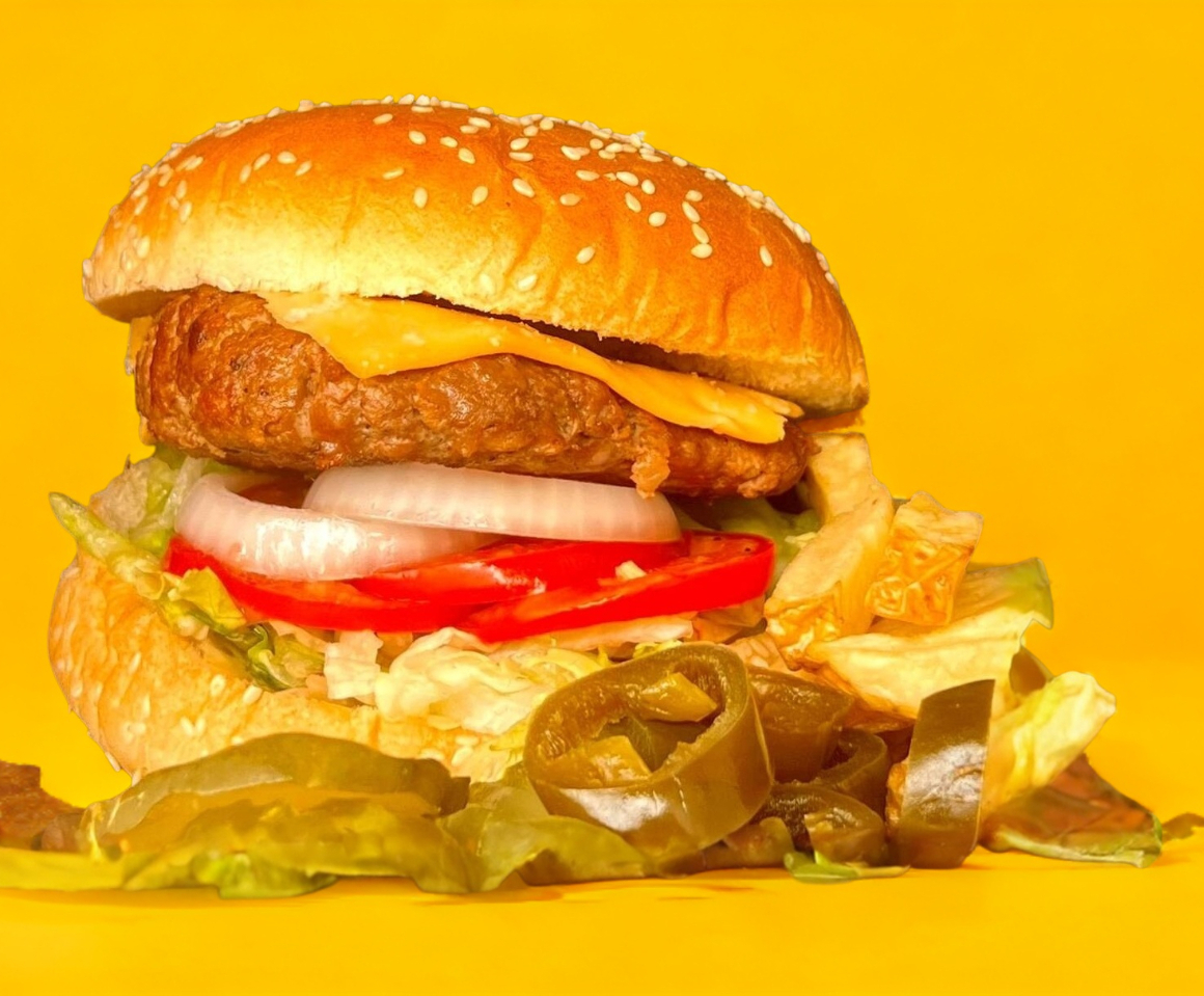 Hamburguesa con carne a la parrilla y queso amarillo.