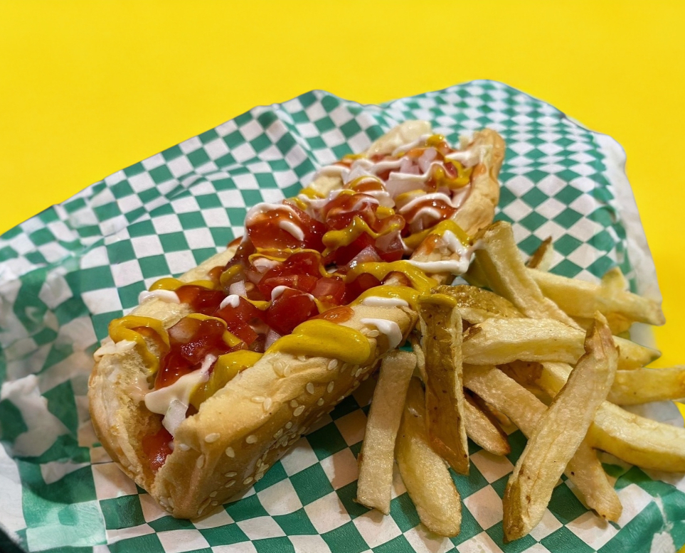 Hamburguesa con carne a la parrilla, queso asadero y salchicha con tocino.
