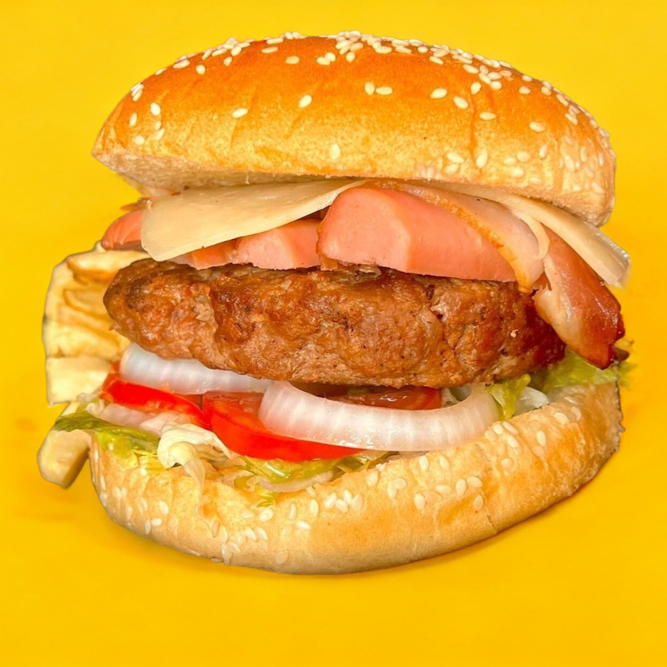 Hamburguesa con carne a la plancha, mortadela, salami, queso de puerco, pastel pimiento, jamón, salchicha y queso asadero.