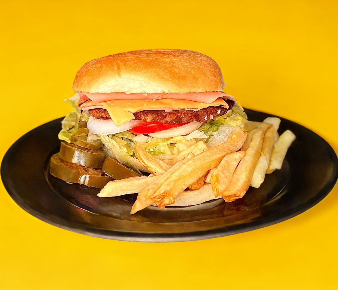 Hamburguesa con carne a la plancha, jamón y queso amarillo.