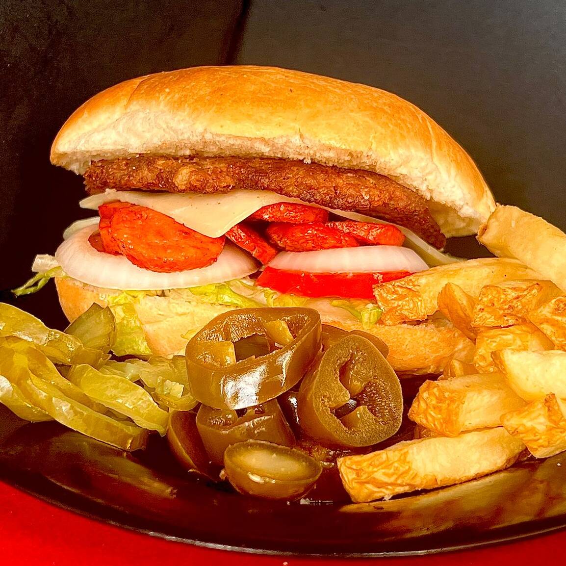 Hamburguesa con carne de res a la parrilla, mortadela, salami, queso de puerco, pastel pimiento, jamón , salchicha y queso asadero.